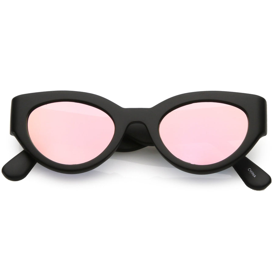 - Bold cat eye sunglasses featuring a thick frame and oval flat mirrored lenses. Accented with stylishly wide arms, these cat eye sunglasses are designed in matte and shiny finishes for a variety of looks. Made with a plastic based frame, reinforced metal hinges, and 100% UV protected lenses.