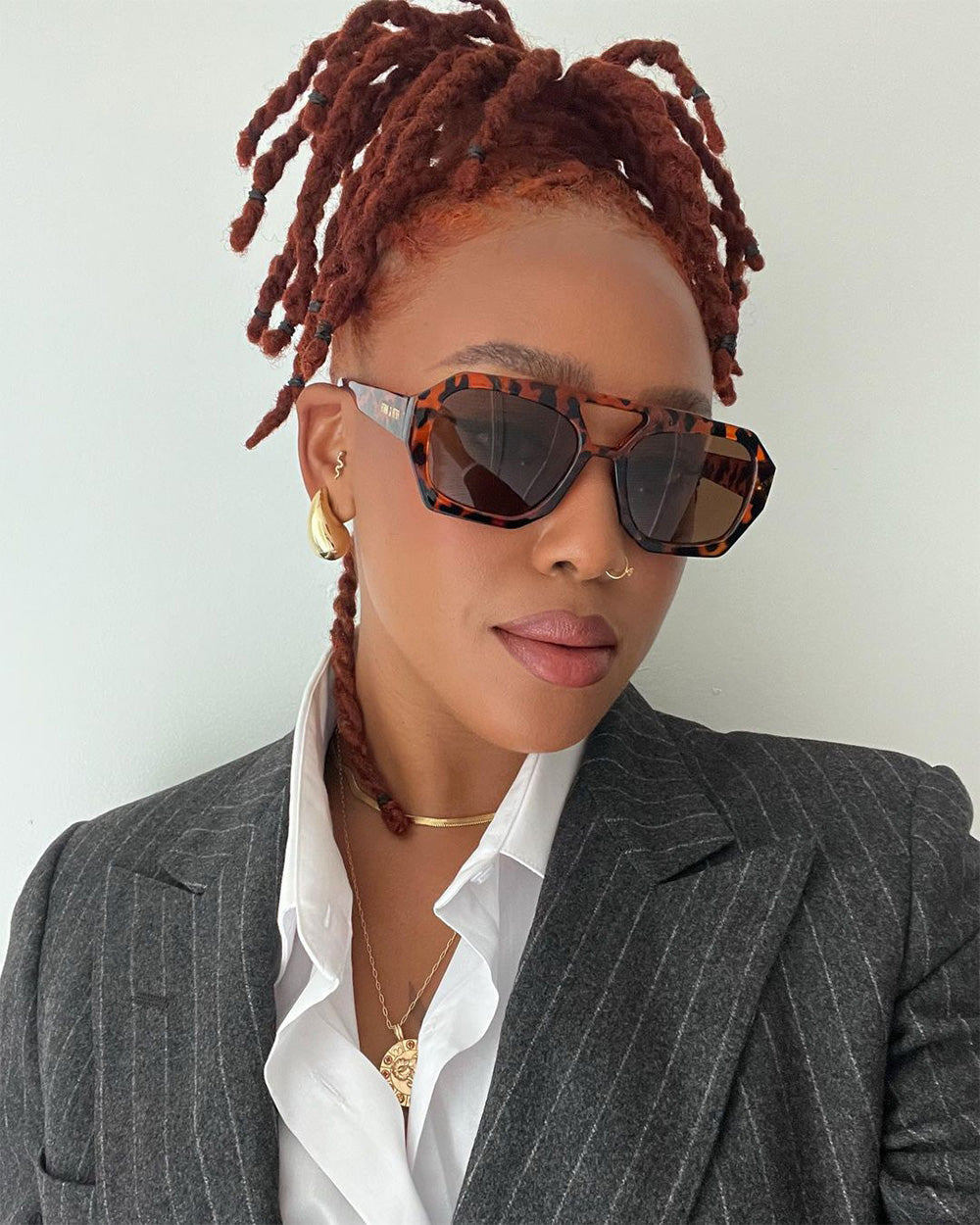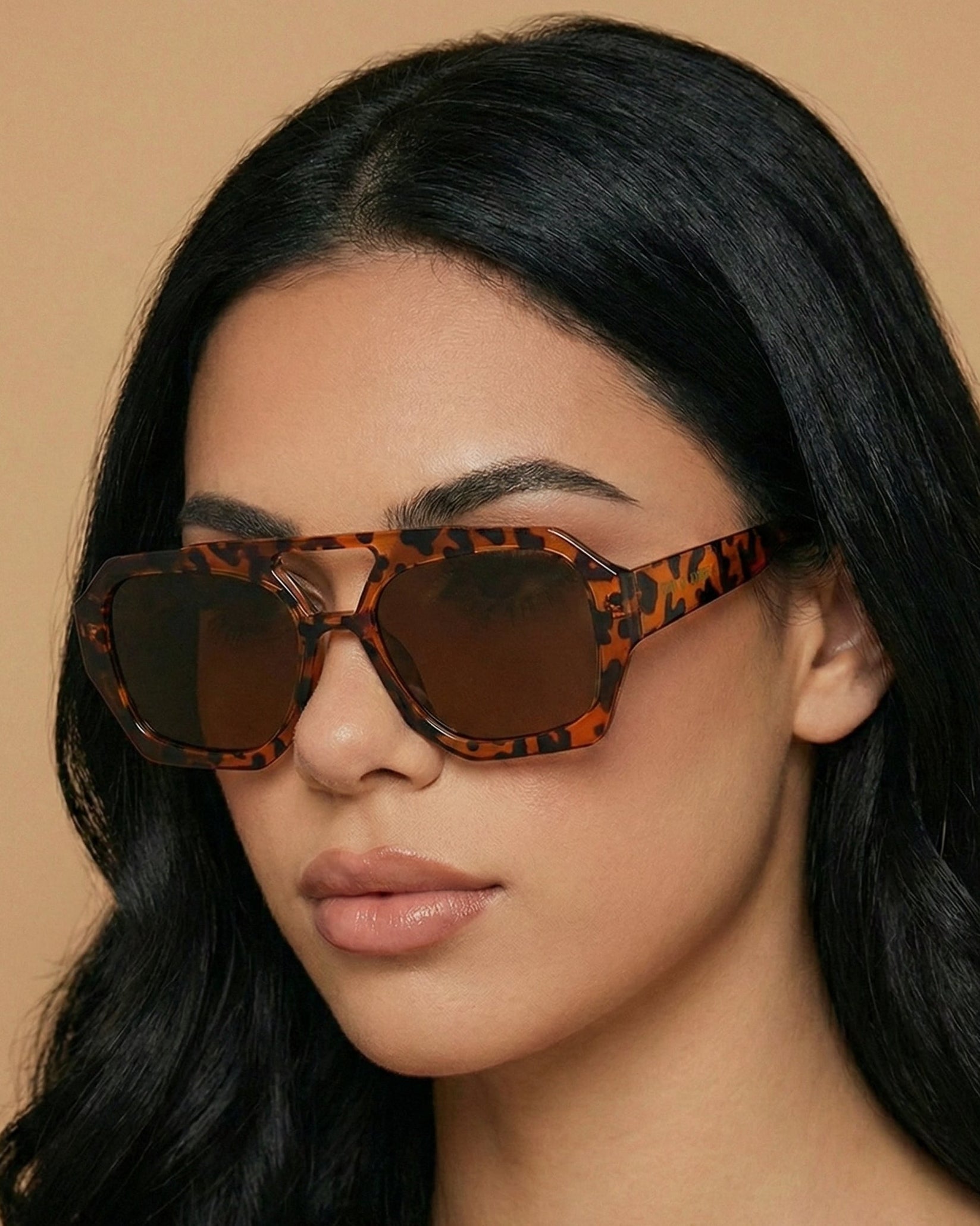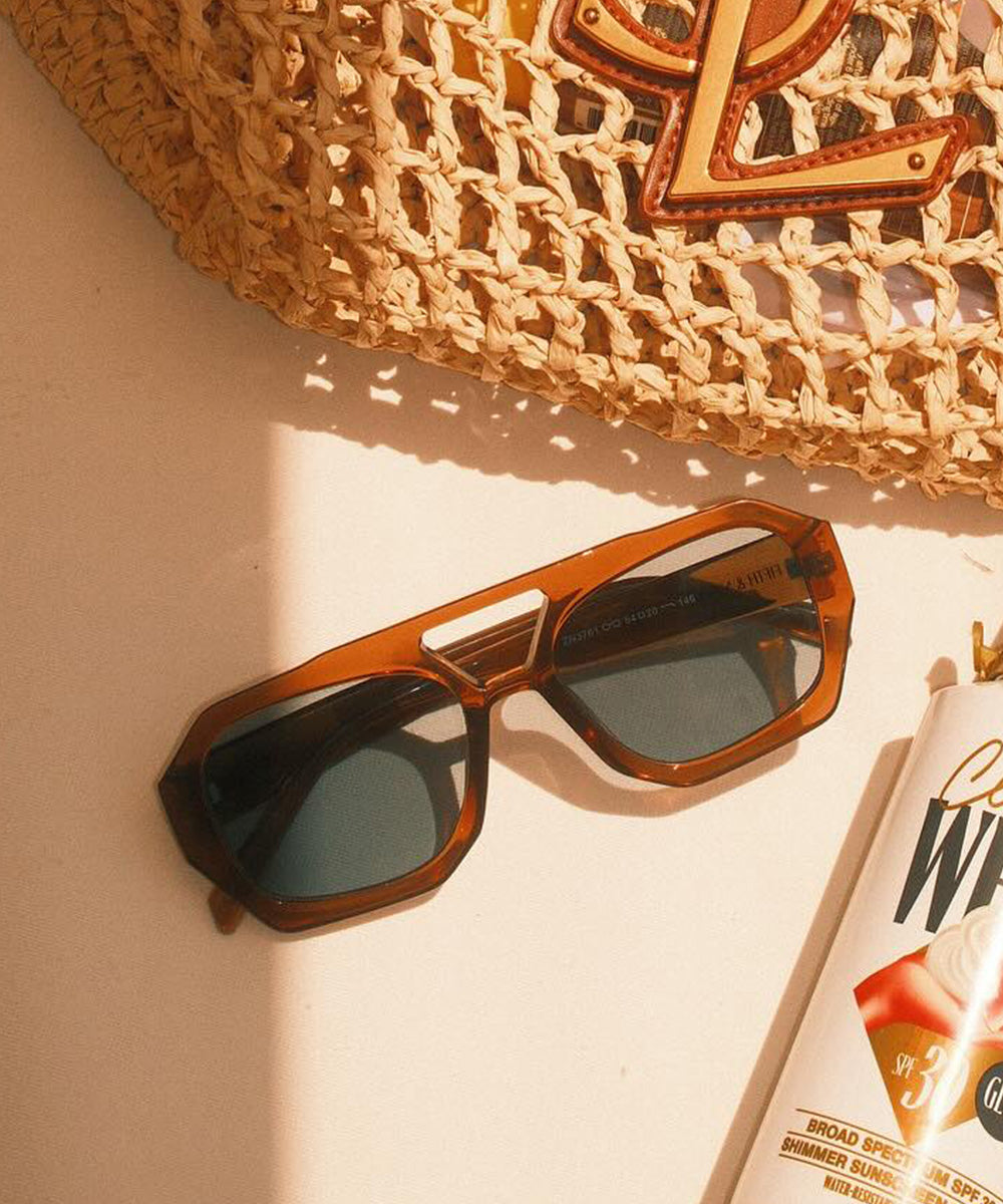 Ryder Polarized Sunglasses feature a geometric aviator frame with oversized lenses for a sporty, trend-forward look. Available in black/orange, black, transparent tan, classic torte, and two new colorways—brown with blue lenses and yellow torte with gradient brown lenses.
