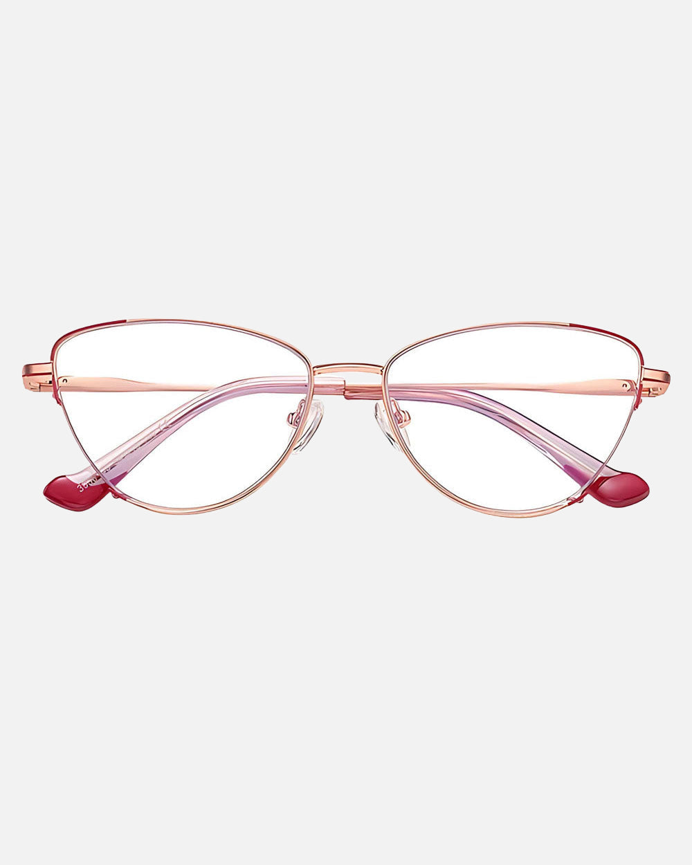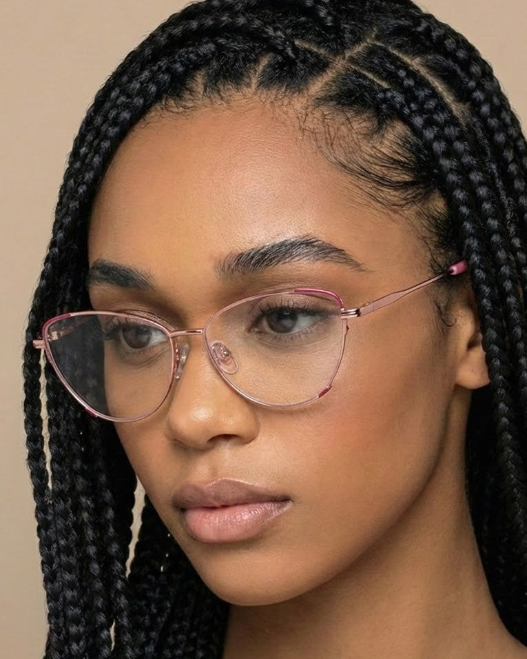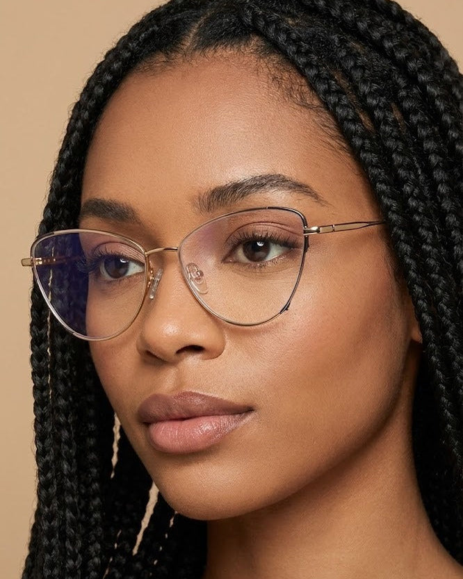 Introducing Cora blue light glasses, a chic metal-frame cat-eye with a playful pop of color. The clear rubberized ear tips provide added comfort while featuring bold accents for a fun twist on a classic design. Perfect for those who want both style and comfort in one sleek accessory.
