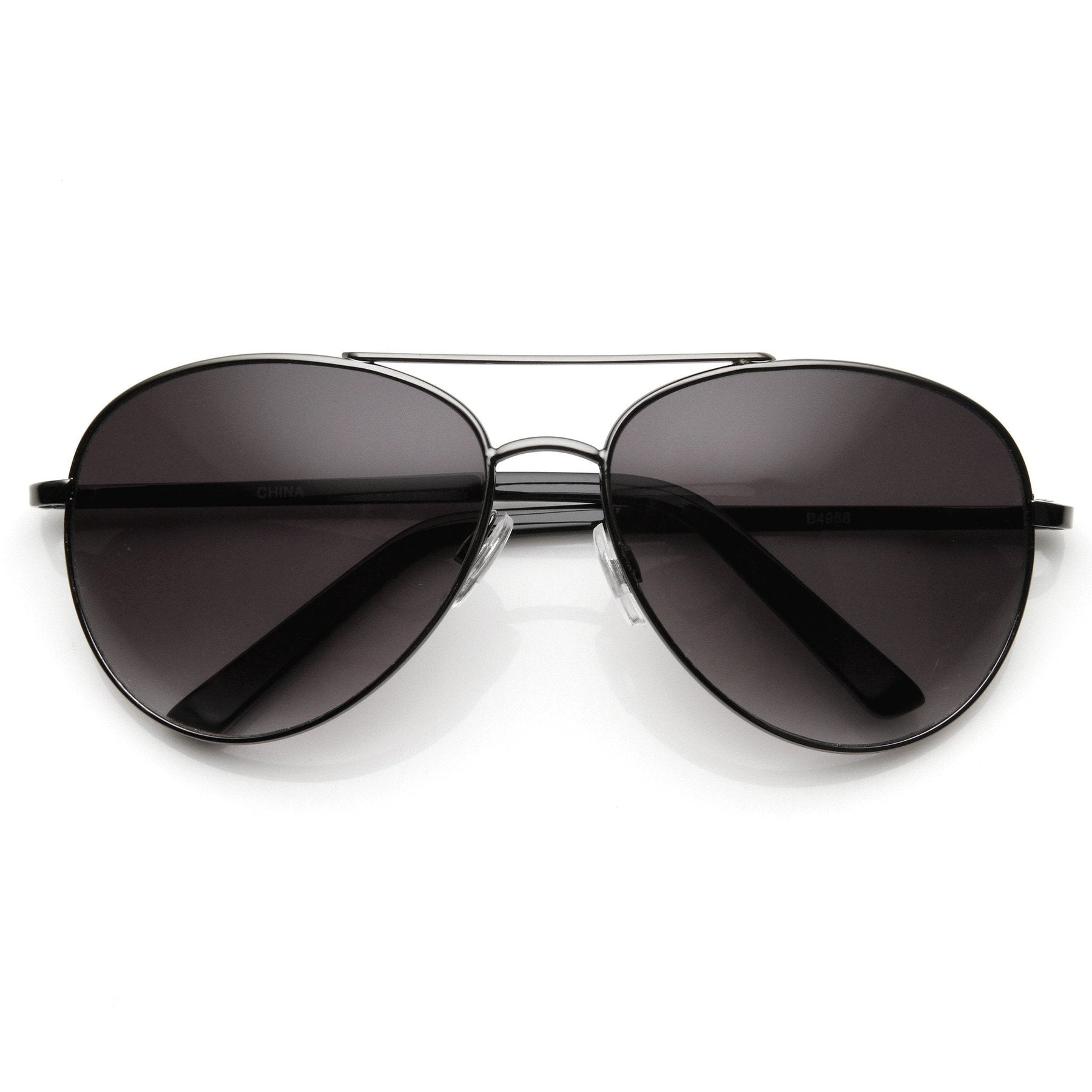 - Classic Aviator Sunglasses with Spring Loaded Arms for flexibility. Available in different frame and lens colors to suit your color style. Features metal hinges, English style nose pieces, and dark-tinted polycarbonate UV400 protected lenses.