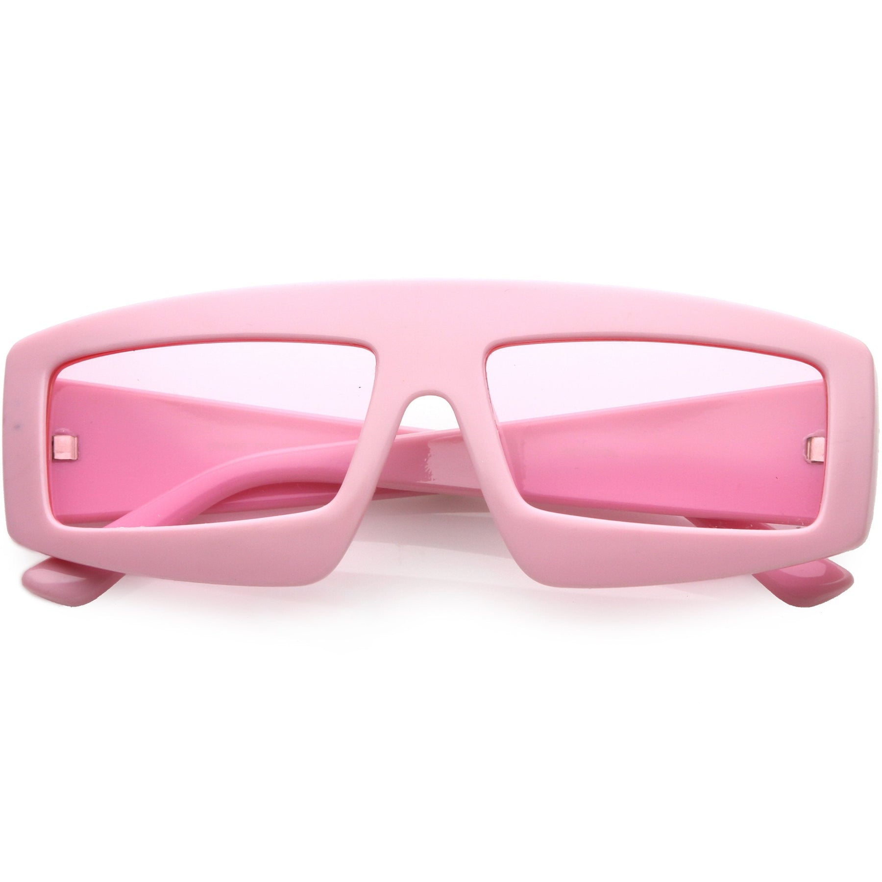 • Featuring an oversize shape, these futuristic rectangle sunglasses are designed with a chunky frame and stylishly wide arms. Contrasted with color tinted lenses for a pop of color, these novelty sunglasses are a fun style to wear during summer. Made with a plastic based frame, reinforced metal hinges, and 100% UV protected lenses.