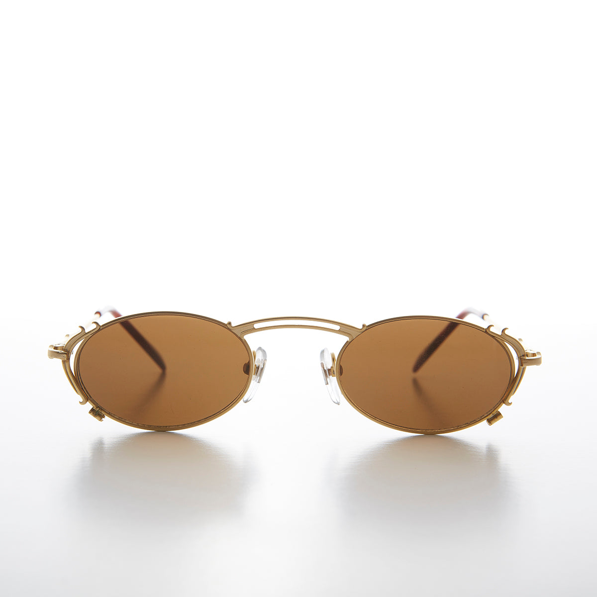 Intriguing, 1990s, oval sunglass that feature an intricate stainless steel optical quality frame. These unique sunglasses are just what you need to spice up your wardrobe this season.